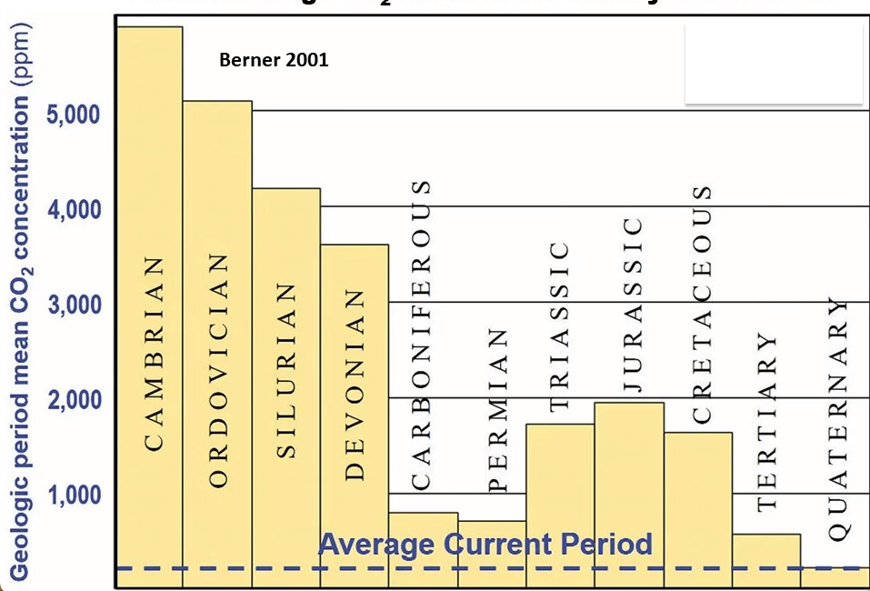 In fact, today we have the lowest average atmospheric CO2 in the last 600 million years.